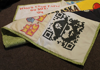 When I say I didn't know what I was doing, I mean I had never quilted before or even really watched anyone make a quilt. I kept thinking that at some point my inexperience would cause me to make a fatal error, but surprisingly everything worked out well. The main flaws that exist are due to the fact that I was working with jersey which can be a bit annoying. ecokaren blogged about her t-shirt quilt, and her tip to apply interfacing to the t-shirt material was a lifesaver. Besides that I learned the quilting basics from a library book, and used pretty prudent's quilt binding cheat to finish the edges.